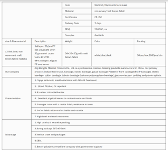 Instrument classification: Class II - Material: melt brown fabric and non woven, melt brown fabric/non woven material